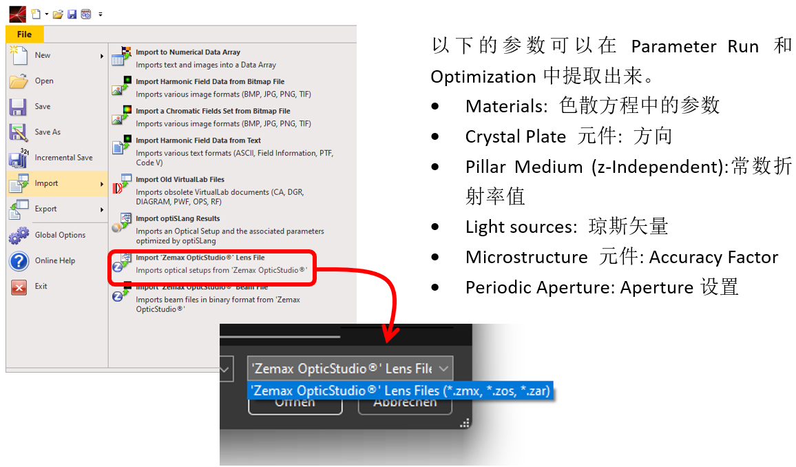 更多类型的Zemax OpticStudio® Lens Files文件可以被导入到VirtualLab中。