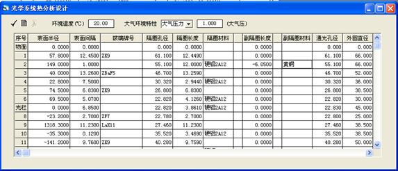 为了适应以上热平衡效果,在OCAD程序主界面的“编辑”菜单内选取“光学系统热环境分析”后会弹出如图1光学系统热环境分析窗体界面。在界面的表格上方给出了“环境温度”和“大气环境特性”的选择。其中大气环境特性的选择还有“大气压力”和“海拔高度”两种方式,其实不同海拔高度也就体现了对应大气压力,由于不同光学产品面对的要求不同,此两种选择方式只是为了适应不同的要求模式而定,程序还可以把海拔高度换算成对应大气压力。