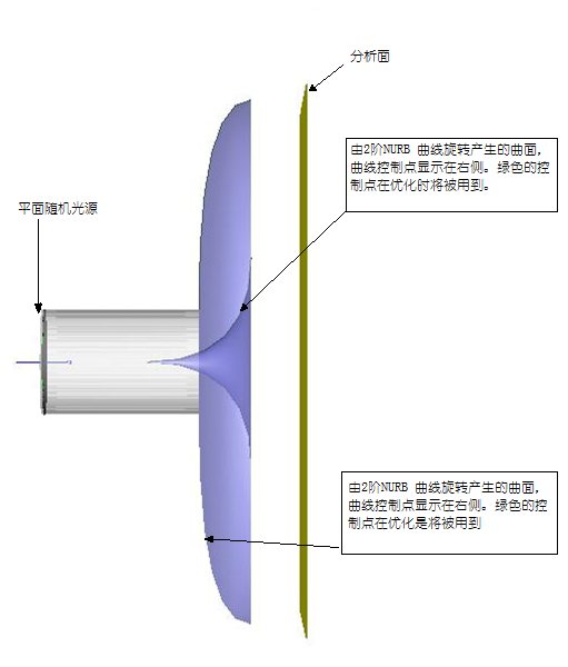 如下图所示,导光管的两个表面都是由2阶NURB 曲线旋转构成。优化过程用到某些控制点的坐标和比重作为变量,在优化过程中改变导光管的形状。如下图所示,绿色的点是在优化过程中将要改变的控制点