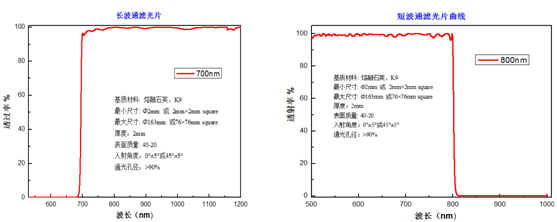 滤光片制备上我们以熔融石英、K9玻璃为基底,表面质量可做到60-40 ,在保障平均透射率大于90%的前提下,截止深度可大于OD4,其测试的典型曲线如图2所示,其他波长、材料、尺寸及特性要求可以按照客户需求定制。