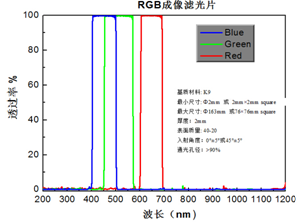 彩色成像滤光片经过精心设计与制造以满足要求严格的机器视觉和成像应用。为了有效的让RGB三色波长透过,可采用图3.b中的RGB成像滤光片让红绿蓝三种波长颜色的光高度透过,截止特定的UV、可见光或IR波长。相较于传统滤光片,这几款硬镀膜滤光片可提供高截止能力(OD ≥3.0)以截止多余的光线,提供较大的入射角范围(0°±5°或45°±5°),平均透过率大于94%,同时也提供较高的耐久性以实现较长的工作寿命。极高且平坦的透射轮廓可实现热门的LED,实现均匀照明。此外,这些滤光片可用于改善图像对比度,同时也可隔离光谱区域和颜色。波长、材料、尺寸及特性要求可以按照客户需求定制。