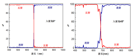 图6. 以0°和45°入射的高性能冷反射镜多层介电膜典型曲线图