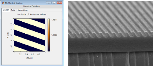 基于VirtualLab Fusion设计的倾斜光栅折射率分布;右图:加工所得的倾斜光栅