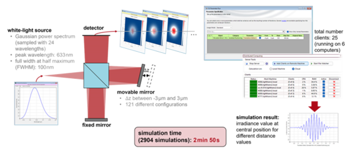 作为第二个例子,我们准备了一个使用白光干涉仪的相干性测量。在这个例子中,多波长以及干涉仪臂的位移会产生总共2904次模拟。通过分布式计算的应用,我们可以将模拟时间从近1小时减少到仅3分钟。