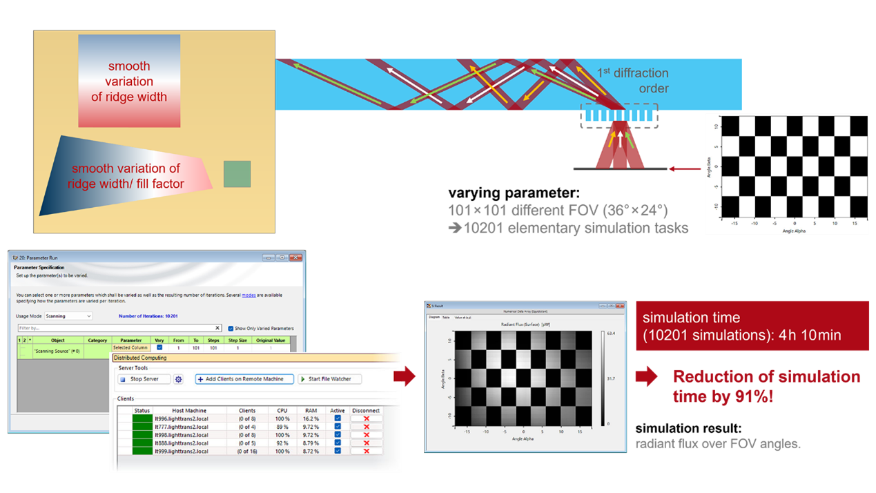 VirtualLab Fusion现在带有了革命性的分布式计算技术,允许您极大地加快您的模拟。为了展示这项新技术的威力,我们准备了两个例子,您可以在下面链接的文档中找到。在第一个实验中,我们通过对101 x 101个视场角度进行参数扫描来研究光波导设备的性能,总共得到了10201个基本模拟结果。使用分布式计算,这些模拟可以在网络中的不同机器上并行执行,在我们的具体例子中,计算时间减少了91%。