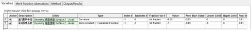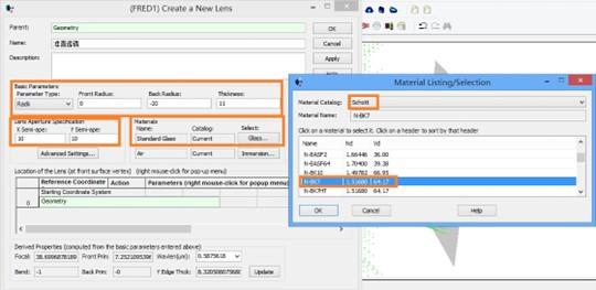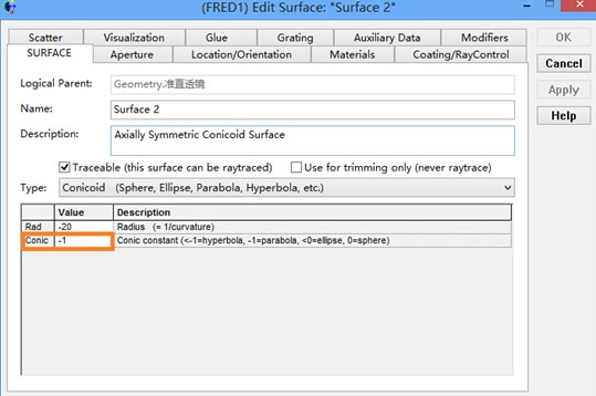 两个面的半径分别为 0 和 -20;半孔径为10*10,材料选择Schott库N-BK7。创建完成后,选择第二面输入圆锥系数-1;