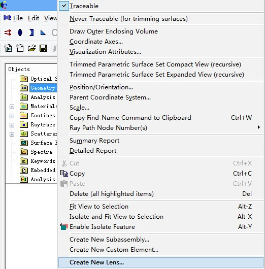 在树形文件夹中选择Geometry>Create a New Lens
