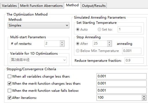 优化方法设定(选择Simplex,并设定优化终止标准)