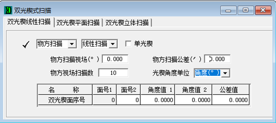 为实现双光楔一维线性扫描系统自动设计,可以在主窗口界面环境下利用“编辑”中的“系统基本数据”菜单窗体内选择“扫描系统”的“双光楔扫描方式”出现设计窗体如图1。