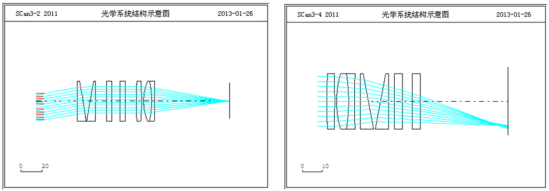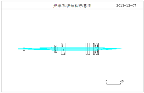 然后在此窗体内选择“物方扫描”或“像方扫描”,再选择“线性扫描”。此时就可以在窗体内填写设计要求,比如物(像)方扫瞄视场(角度)、扫瞄视场(角度)公差要求、指定计算扫描数以及指定光楔角度单位(角度或角分),再就是要指定双光楔在系统内所在面序号。由于双光楔有两个光楔,每个光楔只有一个斜角面,因此在指定光楔面序号时要分别指定前后两个斜角面的斜角面序号。当然还可以给出光楔斜角面的斜角角度参考值及角度公差值。以上信息填写完毕,点击确定按钮“√”程序会立即自动计算出光楔的角度值完成设计。图2就是这的设计满足设计要求的系统结构示意图。图3为双光楔一维线性扫描系统像面误差曲线图供误差分析参考。