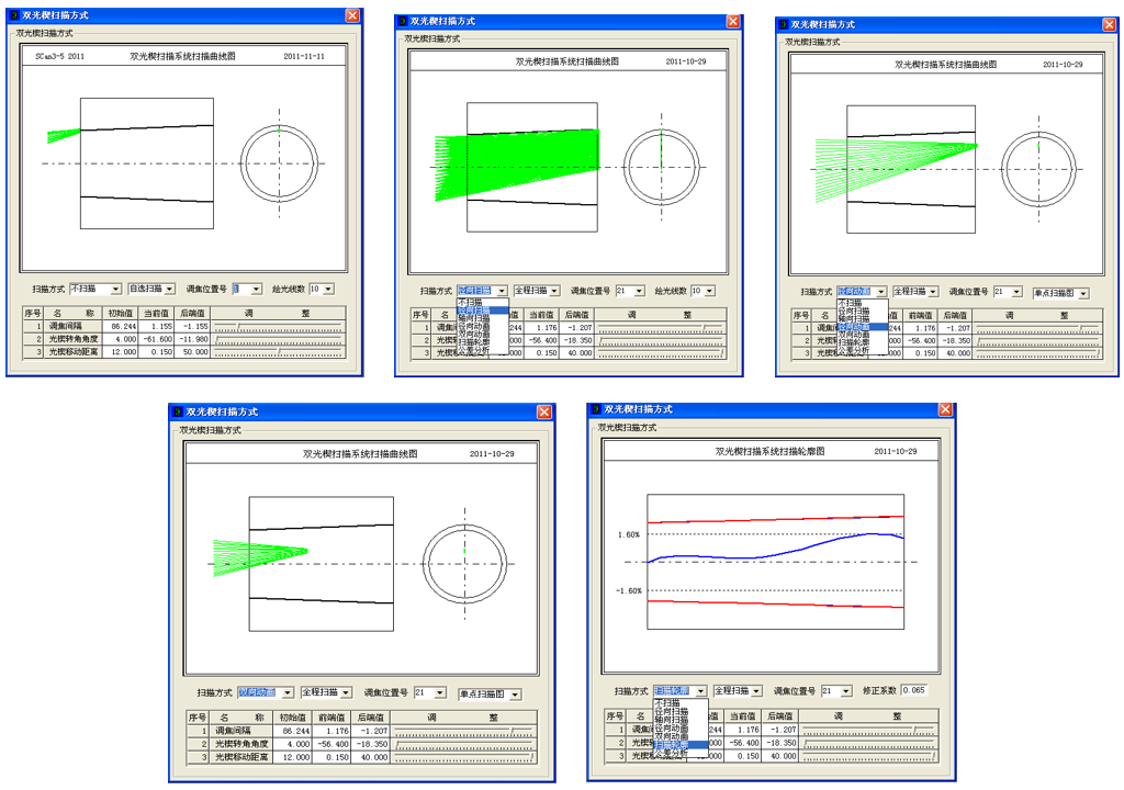 由于双光楔三维立体深度扫描系统设计时变量因素较多,而且各自影响又比较独立,因此采用手工调节的方法比较直观有效,设计时只要在如图8填写完有关参数之后点击“确定”按钮即可出现一幅新的设计画面如图9。利用每行数据右侧滚动条即可随意修改相应参数幷在上方图形中及时动态观察扫描光线变化情况以确定满足要求的设计参数值。为观察设计效果,可以利用图10下方所示 “扫描方式”下拉式菜单观察设计中的各种信息,其中扩扫描光线的各种扫描效果、扫描轮廓图形、图形误差以及扫描轮廓误差及公差分析等,如图9、图10、图11及图12所示。
