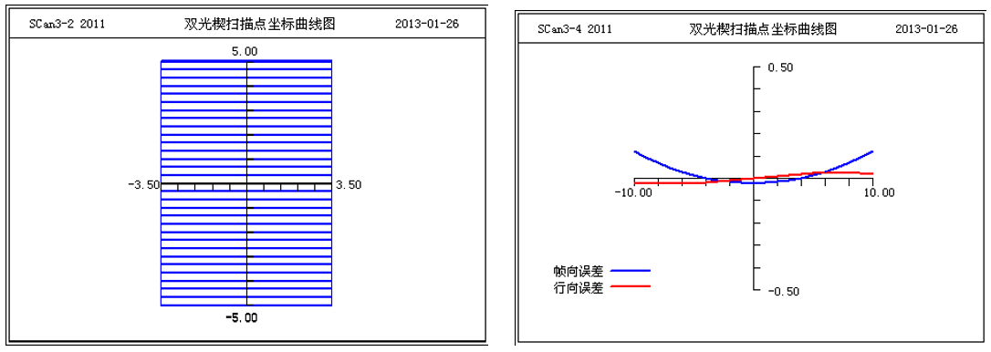 至于二维矩形扫描,也就是利用两对双光楔分别在子午和弧矢两个方向上做线性扫描就可完成。在进行自动设计时,在图4内选择“平面扫描”,窗体会显示需要分别填写子午方向扫描(帧扫)要求及弧矢方向扫描(行扫)要求及两个方向双光楔的所在面序号即可。填写具体含义同一维线性扫描内容。数据信息填写完毕,点击“确定”按钮,程序会立即计算出两组双光楔的角度设计值如图5。图6分别显示了双光楔二维物方矩形扫描系统子午和弧矢两个剖面结构示意图,图6显示了系统物点扫描轨迹及像方扫描点误差曲线。像方扫描点误差相当于物方扫描畸变。