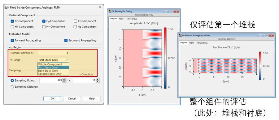 元件内部场分析器:FMM可以输出整个元件(包括基板)内部的场,或者只输出一个堆栈或基块(基板)中的场。