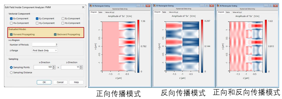 为了更容易地区分入射场、反射场和透射场,可以仅评估正向或反向传播模式,或者评估两者的总和。