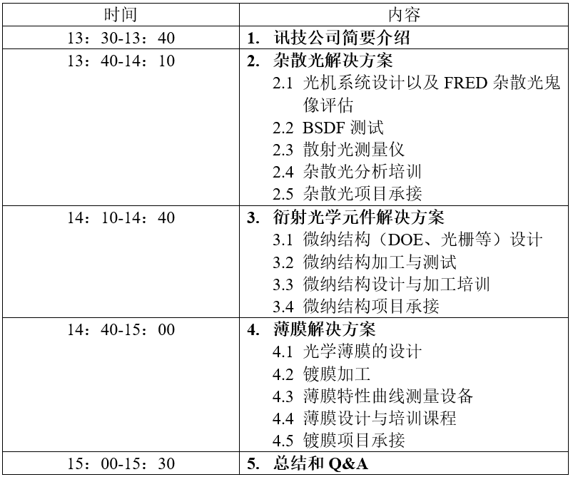 本次研讨会重点讲述在设计和仿真、测试设备、加工、测量服务等方面,如:杂散光解决方案、衍射光学元件解决方案、薄膜解决方案。