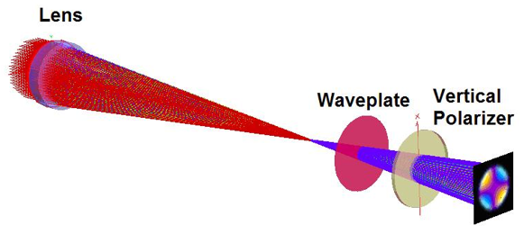在该系统中,相干的水平偏振白光由透镜聚焦。波片放置在焦点之外,然后是垂直线偏振片(图6)。准直的水平偏振光不通过偏振片,然而,水平偏振光线的扩展光束在每个角落处具有一些通过的垂直偏振分量。图7显示了没有波片系统的辐照度。