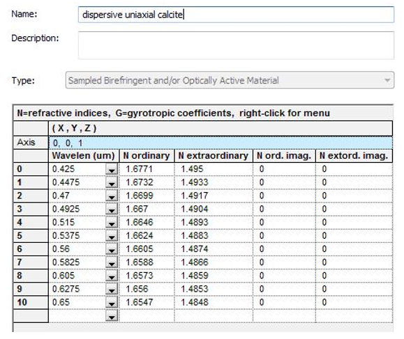 接下来,添加波片(0.00304 mm厚的由双折射方解石制成)。方解石材料是使用FRED的Sampled Birefringent and/or Optically Active Material材料类型创建的。方解石的规格如图8所示。