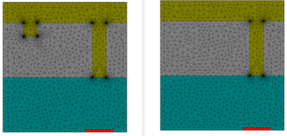 狭缝槽设置(左)和用于归一化的狭缝设置(右)的三角形网格;灰色:银膜,蓝色:基板,红色:检测器区域,绿色:空气;请注意金属角处网格的预细化。