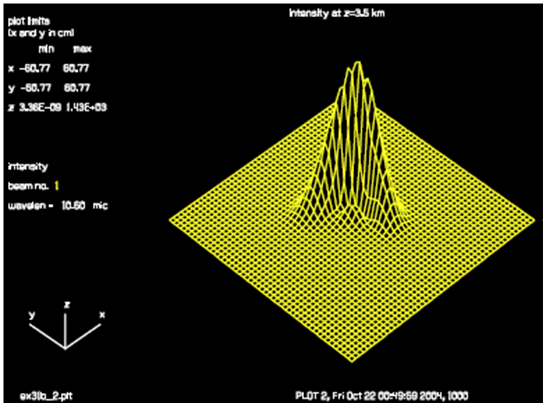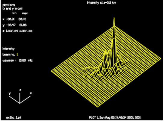 图1.不含大气像差和热晕效应的远场分布,此时光束的焦点在4km处,光斑尖锐。