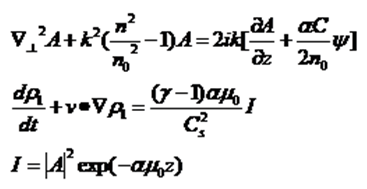 本例介绍了模拟激光在大气中传输时热晕效应对应的bloom命令的使用。描述热晕的基本方程包括波动方程和流体力学方程。首先由Maxwell方程得到激光波动方程,再结合流体力学中的三个守恒定律——质量守恒定律、动量守恒定律、能量守恒定律得到描述热晕效应的方程。对于理想气体,在等压近似下得到: