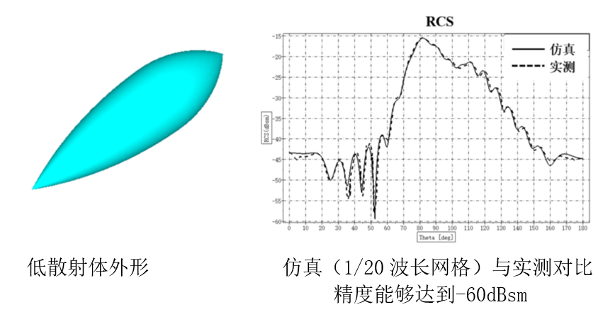 1.低散射体RCS计算模式:针对“传统FDTD软件对低散射体RCS计算普遍不准”的问题,EastWave开发出了针对低散射物体RCS精确计算的模式。低散射体特征为尖头、扁平、大后掠、外形线平滑等,RCS值达到-35dBsm或更低,传统FDTD软件需要划分1/100波长网格,这造成内存和计算量暴涨而“不能算”。EastWave低散射体RCS模式,在1/20波长网格就可以精确计算-60dBsm的RCS值。