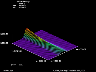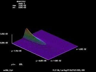 本例重点展示了beer以及sfocus两个命令的使用,给出了经过吸收之后高斯光束的强度分布轮廓图,光束的吸收遵循比尔定律并且可能会出现自聚焦现象。